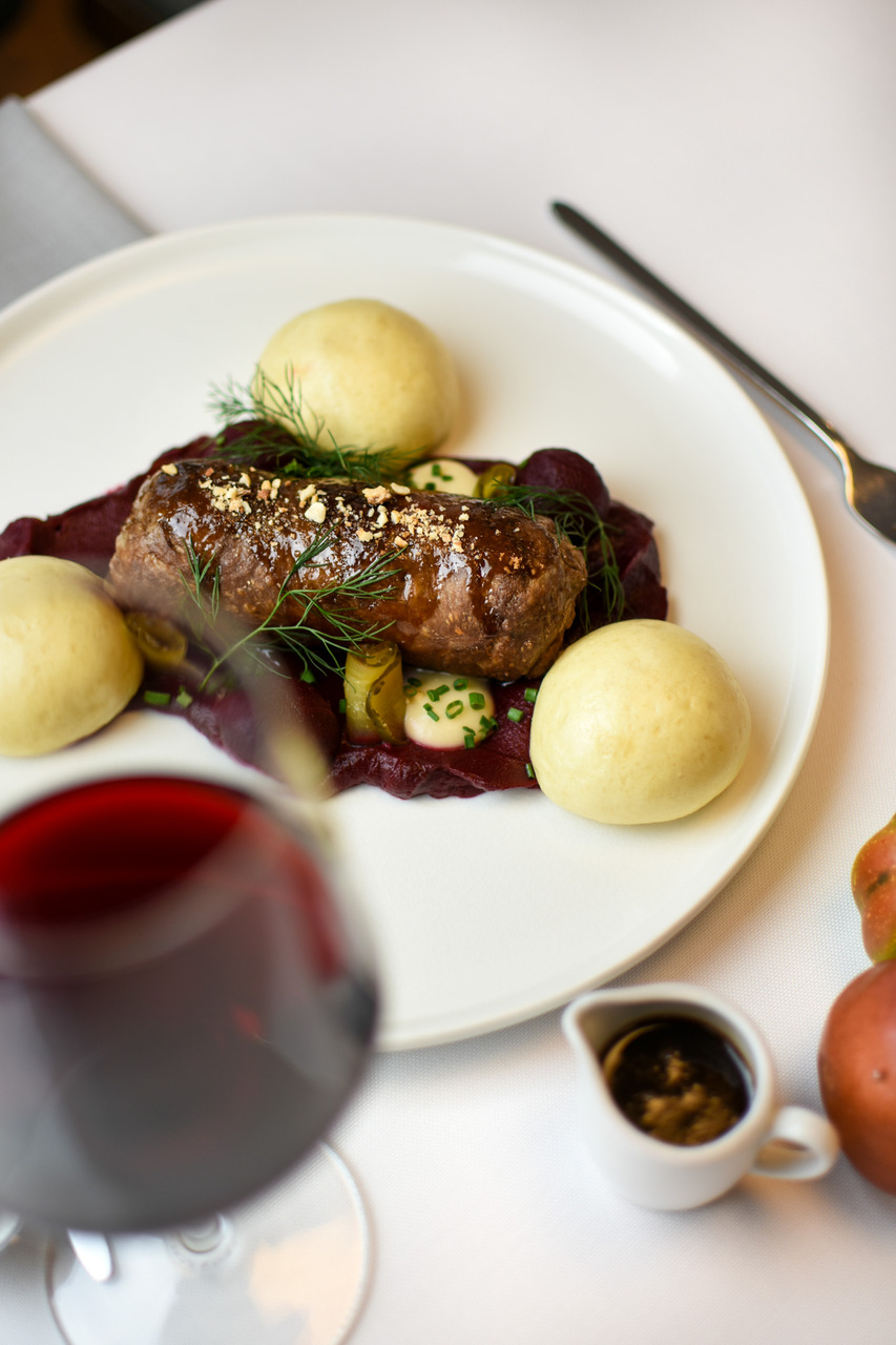 79 złFarsz z boczku, ogórka kiszonego i cebuli, pyzy drożdżowe, mus z buraka, ogórek kiszony, buraczki marynowane, mus z jabłka, demi-glace