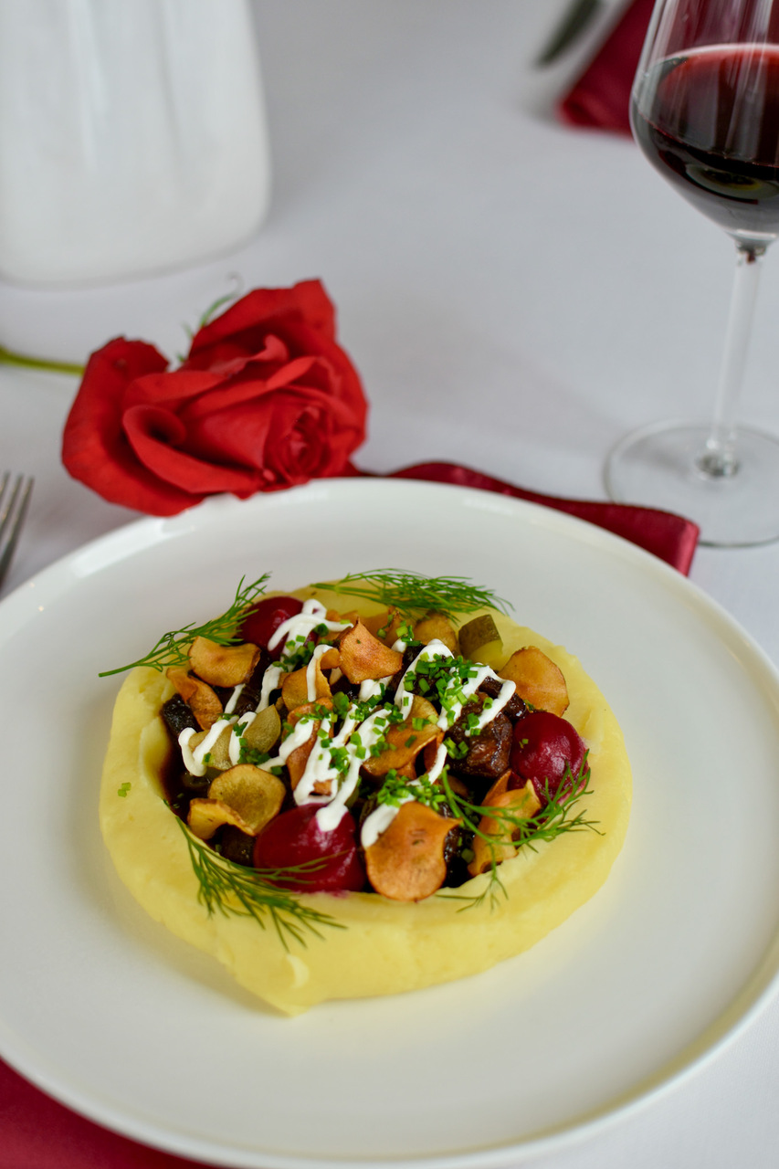 81 zł Ziemniaki z musztardą francuską, grzyby shimeji, cebula, szczypiorek, puree z buraka, sos dijon